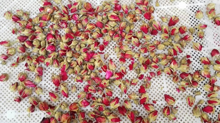 烘干前的準(zhǔn)備是:如果花蕾是在雨后采摘,需要將其表面的水晾干后加工,如果是晴天采摘直接加工即可。首先將花蕾放在烘干盤上,還需要挑出已經(jīng)開放的花朵,因為已經(jīng)開發(fā)的花朵所含的營養(yǎng)成分較少,且花瓣容易脫落。